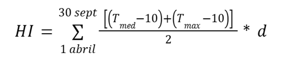 Índice de Huglin: Es un índice agroclimático que permite la división en zonas en función de las calidades de la uva u otras características del vino derivadas de la influencia climática. Este índice muestra una buena relación entre las zonas con el potencial de azúcares de la uva. Se utiliza para determinar la idoneidad de una zona para el cultivo de la vid. Este índice tiene en cuenta las temperaturas máximas y medias desde abril a septiembre.